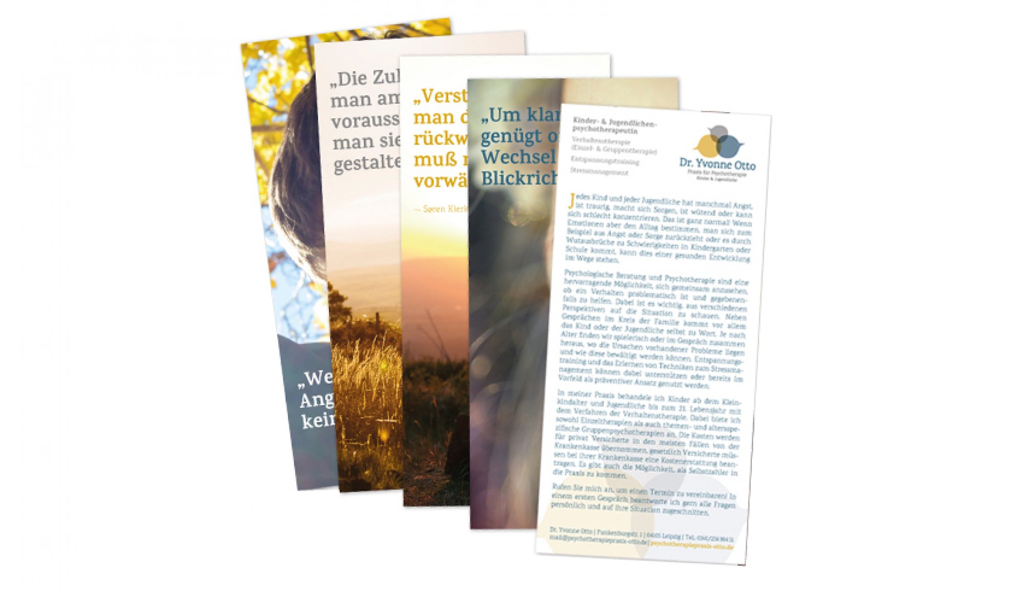 Frau Dr. Yvonne Otto wagte den Schritt in die Selbstständigkeit. Im Mai hat sie ihre Praxis für Beratung und Therapie in der Funkenburgstraße in Leipzig eröffnet. Die Kindheit und Jugend verlaufen nicht immer leicht. Als Hilfestellung bietet sie psychologische Beratung, Krisenintervention und Psychotherapie. Wir haben sie mit der Existenzgründerberatung erfolgreich auf ihren Weg gebracht. Für ihren Außenauftritt haben wir gemeinsam mit ihr eine Website, Flyer und Logos erarbeitet und erstellt.