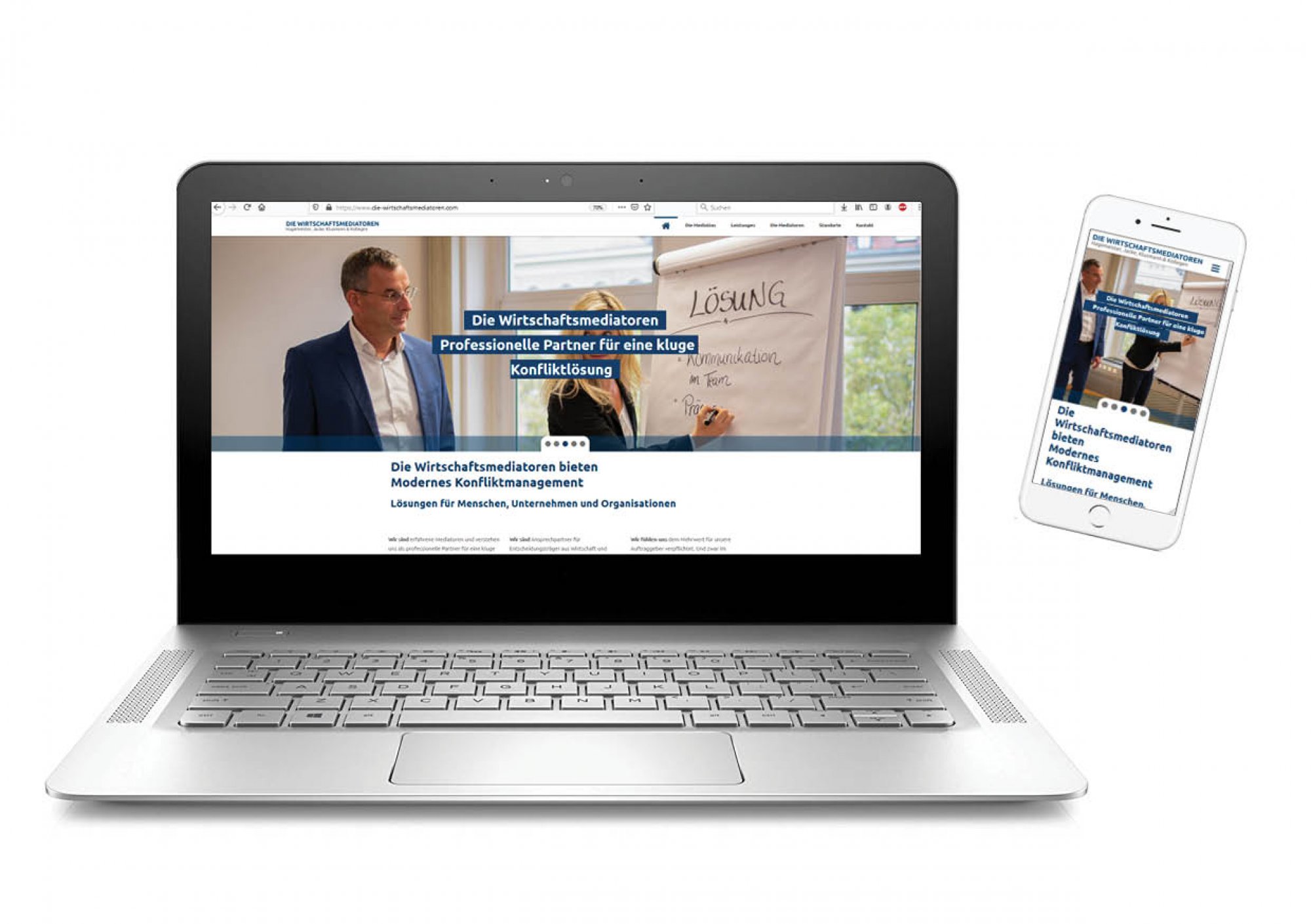 Auf der von uns entworfenen Internetseite wurde ihr Angebot des „Modernen Konfliktmanagements“ herausgearbeitet. Ebenfalls dass sie eine deutschlandweites Netzwerk sind, das bundesweit im Einsatz ist. Diese Professionalität wurde in der Gestaltung der Internetseite, aber auch in der Umsetzung der Fotos gut umgesetzt.